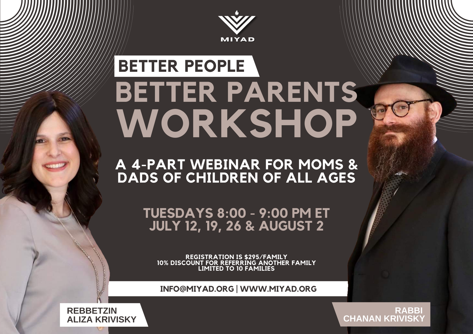 Rabbi & Aliza will share the timeless wisdom of our Sages, personal experience as parents of 10(!) kiddos, and clear methods relevant to our modern age to improve your relationship with your child.